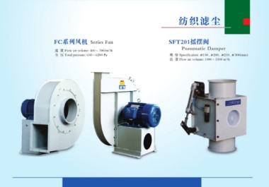 FC系列风机 Series Fan SFT201摇摆阀 流 量 Flow air volume: 400~7000m3/h Pneumatic Damper 全 压 Total pressure: 650~6200 Pa 规 格 Specification: 150、 200、 250、 300(mm) 流 量 Flow air volume: 1000~5500 m3/h