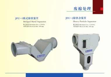 JFU-1桥式除铁装置 废棉处理 Bridged Metal Separator JFU-2除铁杂装置 阻力损失 Resistance loss: ≤100 Pa Heavy Particle Separator 风管直径 Dia.of air duct: 300 mm 阻力损失 Resistance loss: ≤100 Pa 风管直径 Dia.of air duct: 300 mm