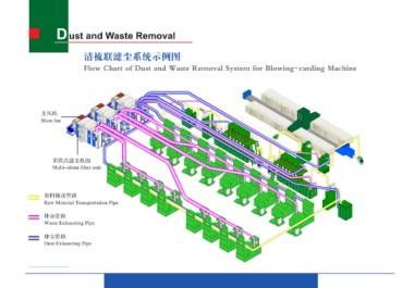 清梳联滤尘系统示例图 Flow Chart of Dust and Waste Removal System for Blowing-carding Machine 主风机 Main fan 多筒式滤尘机组 Multi-drum filter unit 原料输送管路 Raw Material Transportation Pipe 排杂管路 Waste Exhausting Pipe 排尘管路 Dust Exhausting Pipe